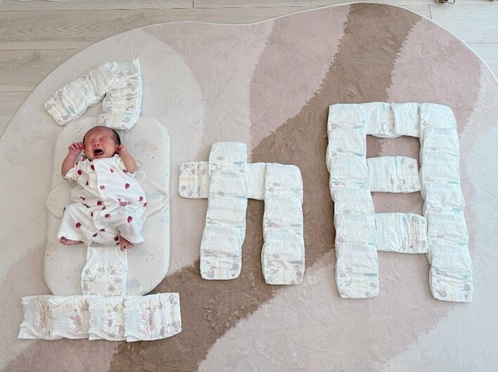 辻󠄀さんら家族は夢空ちゃんの周りにおむつを並べ、“おむつアート”で「1ヵ月」という文字を自宅の床に描いたようで、その「1」の位置に寝かされた夢空ちゃんは、大きな口を開けて顔を赤らめて元気に泣いています。