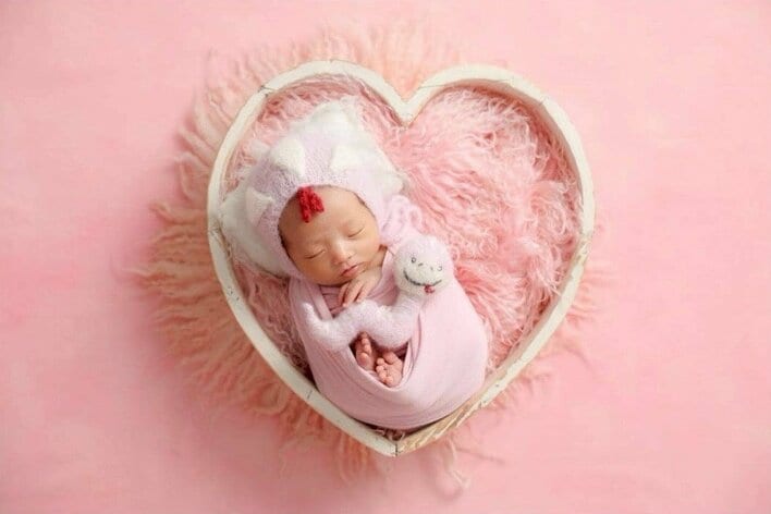 淡いピンクのおくるみにぎゅっと包まれてすやすやと眠る夢空ちゃんは、ハート型のかごにすっぽりと収まっていて、体の上にはへび年生まれの夢空ちゃんにあわせたのか、ふわふわのへびのぬいぐるみが添えられています。