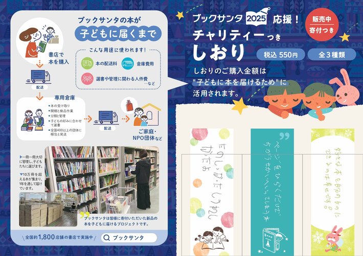 大変な境遇にいる子ども達に新品の本を贈る「ブックサンタ」。昨年の「ブックサンタ2024」では合計130,843冊の本が寄付され、全国の子ども達に届けられました。今年の「ブックサンタ2025」のパートナー書店は昨年から17店舗減り、1,851店舗と開始以来初めて減少。近年の書店業界を取り巻く環境は厳しいものの、今年はブックサンタの活動を応援できる「しおり」の販売という新たな取り組みもスタートします。本を子ども達に届けたいという想いの輪は、より一層広がっています。開催期間は9月23日(火)~12月25日(木)です。オンライン書店では12月26日(金)まで寄付を受け付けています。