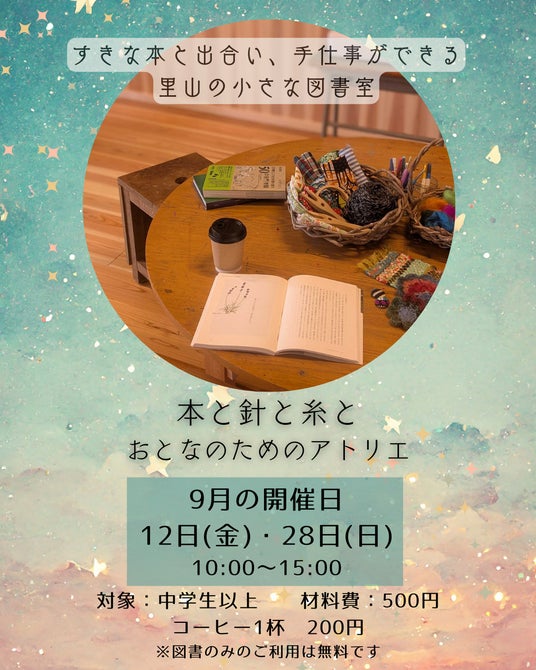 すきな本と出合い、手仕事ができる場所。小さな図書室で、おとながゆるやかに過ごせる時間を用意しています。里山で自分のための時間を過ごしませんか?