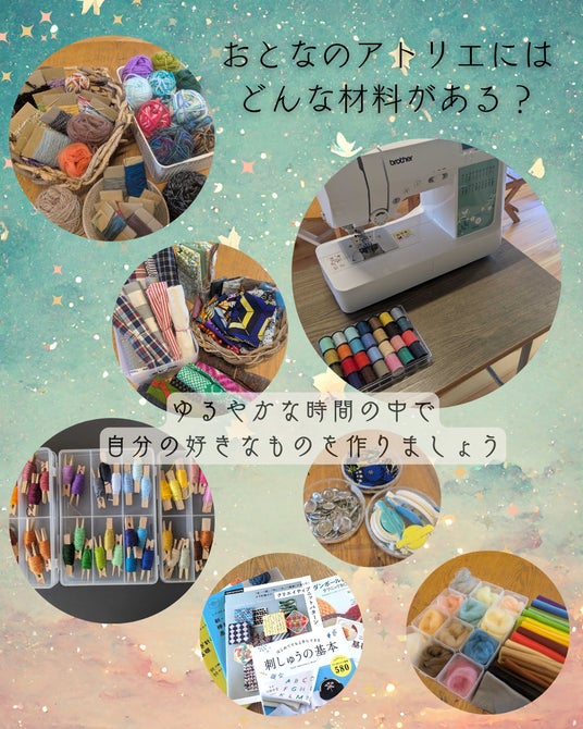 羊毛フェルト、布・はぎれ、毛糸、刺しゅう糸、ミシン、ビーズ、フェルト、クロスステッチ、くるみボタン、ダンボール織機