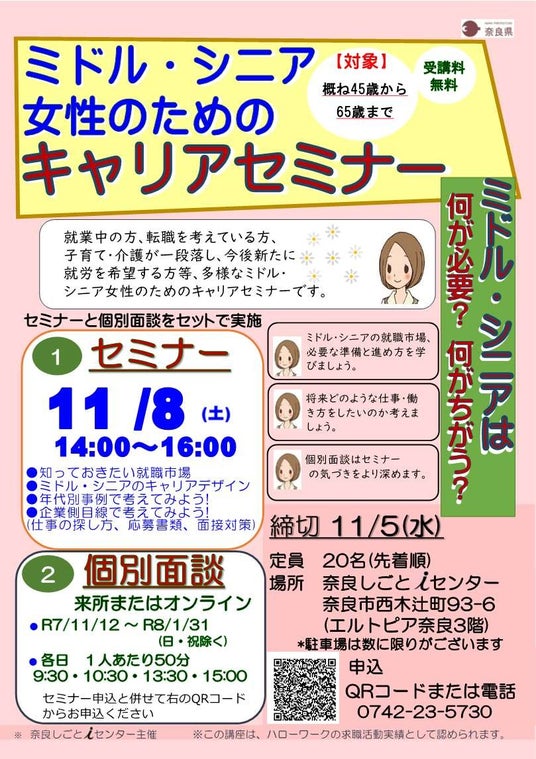 就業中の方、転職を考えている方、子育て・介護が一段落し、今後新たに就労を希望する方等、多様なミドル・シニア女性のためのキャリアセミナーを開催します。