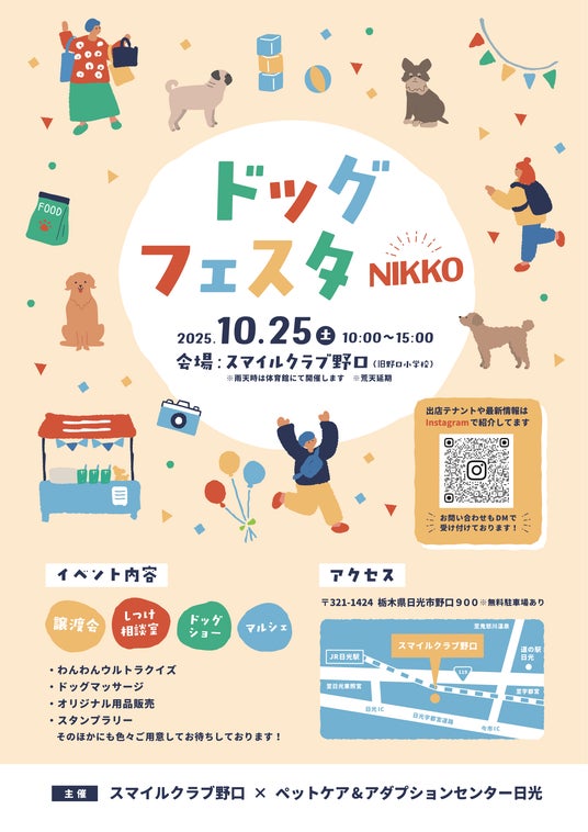 また、2025年10月25日(土)には、栃木県日光市野口にあるスマイルクラブ野口にて、ドッグイベント「ドッグフェスタNIKKO」を開催いたします。
