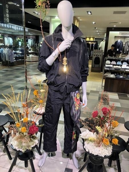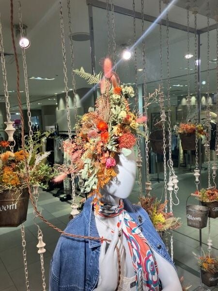 店内のディスプレイでは、ロスフラワー(R)と倉庫に眠っていた装飾品を使用してディプレイに! 大丸梅田店南側エスカレーター前のフォーカススポットを、ぜひ御覧ください。(一例)