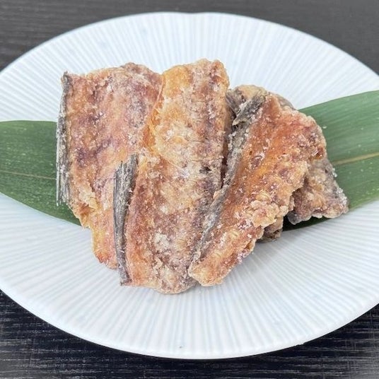 あじフライを作る際に出る副産物の骨に、塩・こしょう・片栗粉をまぶし油でカリッと揚げ、仕上げにうまみ調味料と塩をまぶしたカルシウムたっぷりの骨せんべいです。