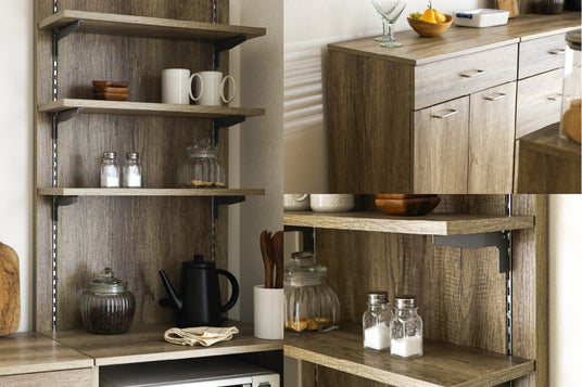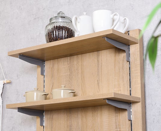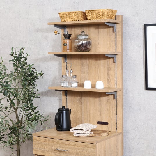別売りの各種キッチンボードに取り付けて、収納スペースを手軽に拡張できるバックボードです。食器や調味料などのキッチン小物をしっかり収納できる3段の棚は、置くものに合わせて高さ調節が可能。さらに、2口コンセントも備えており、電気ポットなどの家電もスマートに設置できます。