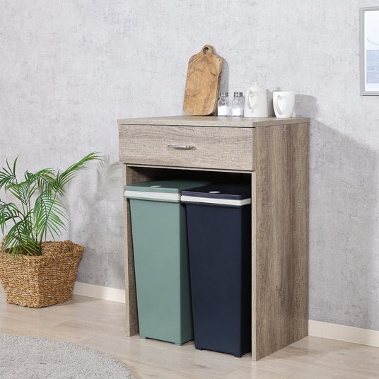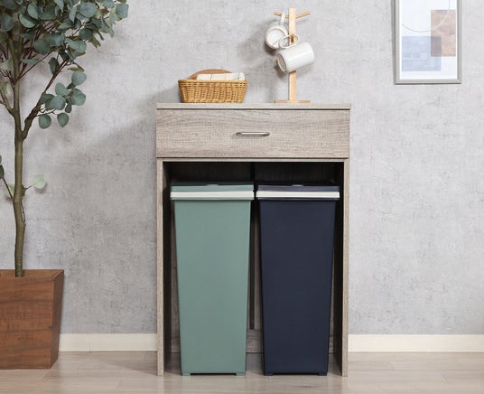 キッチンのゴミ箱上のデッドスペースを有効活用し、より快適な作業空間をつくる収納ラックです。幅56×奥行38.5×高さ67cmのスペースにはゴミ箱がすっきり収まり、引き出しにはカトラリーやゴミ袋などの小物を収納可能。生活感を隠しながら、キッチンまわりをすっきり整えられます。