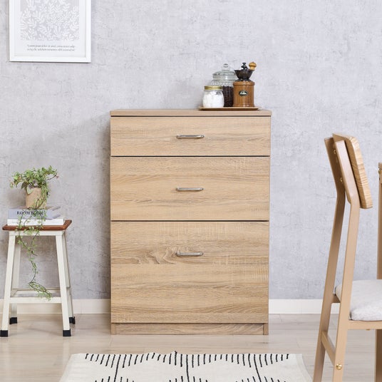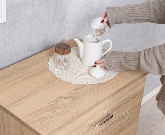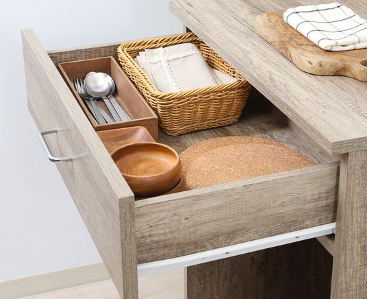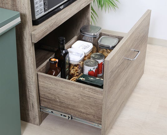 使い勝手の良いキャビネットで、3段の引き出しには食品ストックはもちろんリビングまわりの小物まで幅広く収納可能。高さ85cmの天板は作業台としても使いやすく、トースターなどの家電を置くのにもちょうどよいサイズです。