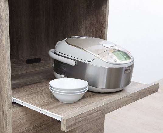 調理家電の設置に便利なレンジボードです。オープン収納部分にはスライドレールを採用しており、炊飯器やポットなどの出し入れがスムーズ。さらに2口コンセント付きで、コードの取り回しに悩むことなく、毎日の作業が快適になります。