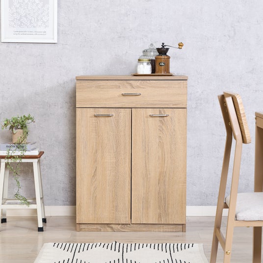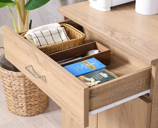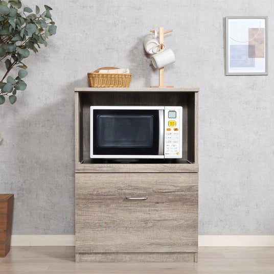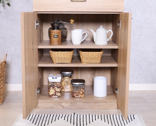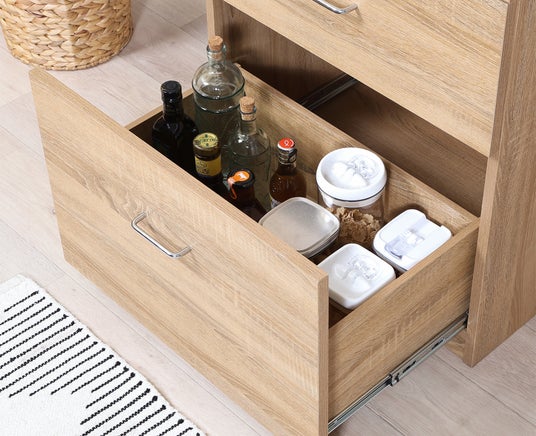 引き出し1杯と扉収納を備えた、収納力と使い勝手に優れたチェストです。引き出しにはカトラリーやキッチン小物、文房具などの細かいアイテムをすっきり整理でき、扉収納には食品ストックや大きめの鍋などもしっかり収まります。収納の幅が広く、キッチンはもちろんリビングでも活躍します。