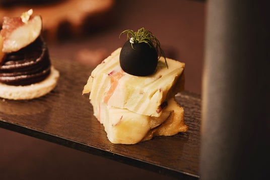 続いて、焼きたての「フォンダンショコラ ラズベリーソース添え」は、ひんやりとしたローズ香るラズベリーソースをかけてお召し上がりいただきます。スタンドスイーツには、ガナッシュと柚子のパートドフリュイをココアサブレに閉じ込めた「サブレ・フルール・ド・ユズ」や、ミルクチョコレートにアッサムティー香る洋ナシを合わせた「ショコラ・グラン」など、多様な味わいのチョコレートを堪能できる6種類の秋らしいスイーツがスタンバイ。セイボリーには、サツマイモをスモークサーモンやアボカドと重ねチーズたっぷりの生地で焼き上げた「ガトーインビジブル」や「トリュフ風味のライスコロッケ」など5種類をご用意します。ドリンクは、燻製和紅茶や日本伝統茶を含む20種類以上のドリンクを120分間のフリーフローでご利用いただけます。
