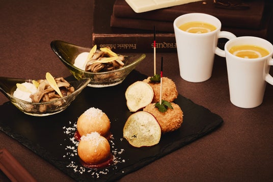 (左上)茸のバルサミコ酢マリネ ~マスカルポーネチーズ添え~ (左下)チーズボール (右上)かぼちゃのポタージュ (右下)トリュフ風味のライスコロッケ