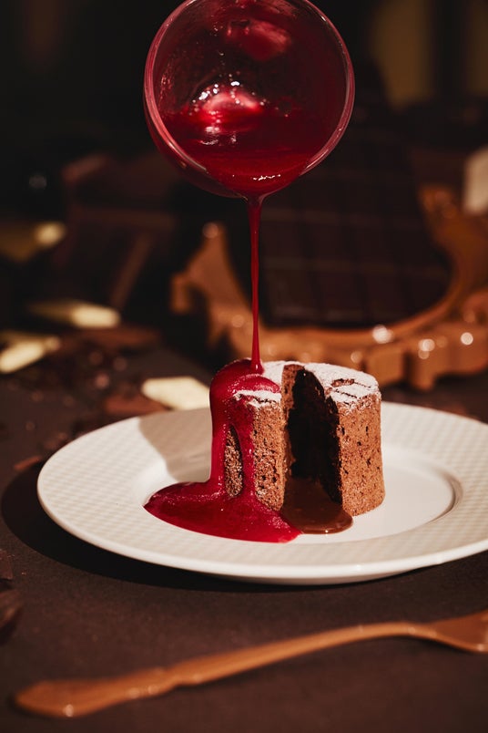 チョコレートを味わう焼きたての濃厚なフォンダンショコラ。液体窒素を使用した、ローズ香るラズベリーソースの演出とともにお愉しみください。