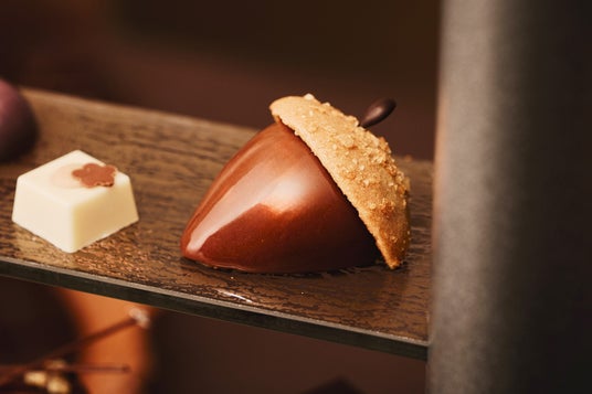 カカオとミルクの風味が特長のミルクチョコレートのムースにアッサムティーに漬け込んだ洋ナシをたっぷり詰め込み、サクサクのサブレを飾ってどんぐりを表現しました。
