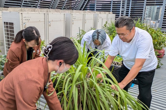 【屋上菜園でレモングラスを収穫するスタッフ】