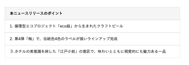野村不動産ホテルズ株式会社(本社:東京都港区/代表取締役社長:石井康裕、以下「当社」)が運営する「庭のホテル 東京(以下「庭のホテル」)」は、循環型エコプロジェクト「eco庭」の一環として、ホテル屋上で育てたハーブや蜂蜜を活用したオリジナルクラフトビール「庭のビール NIWA BEER(以下「庭のビール」)シリーズを開発・販売。2023年に発売された第1弾「山葵」から始まり、現在ではホテル屋上産のハーブや蜂蜜を取り入れた商品開発を進めており、9月12日(金)より第4弾として「庭のビール 梅」を限定販売いたします。
