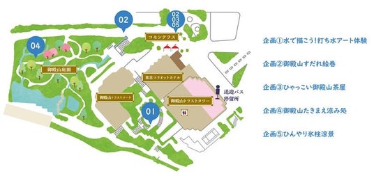 水で描こう!打ち水アート体験 打ち水アートは、打ち水を行うとイラストが現れるストリートアートです。打ち水は、地面の熱を奪い気温を下げる効果があり、日中でも体感温度が約1.5℃*下がることが報告されています。江戸時代には、涼しく過ごすために打ち水が広く行われていました。本イベントでは、打ち水によって地面に御殿山をイメージしたアートが描き出されます。「暑さ対策」と「御殿山」の要素を組み合わせたアートをぜひお楽しみください。