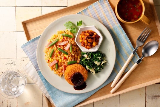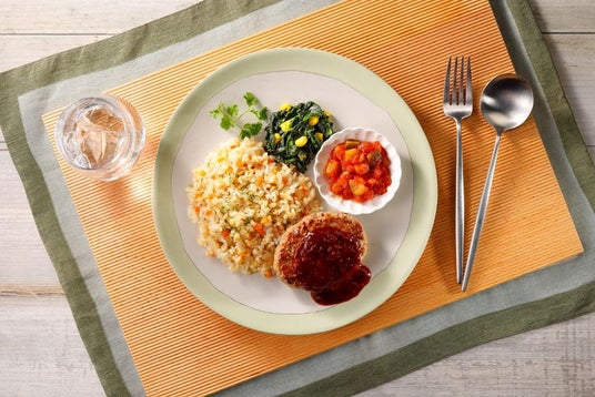 ジューシーなメンチカツにデミグラスソースをかけて、もちぷち食感のもち麦と大豆入りのベーコンピラフとのコンビです。ピリ辛のチリコンカンなどの副菜も詰め合わせた洋風メニューです。