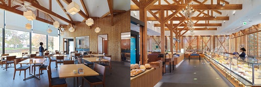 画像左はカフェコーナー、右はショップコーナー