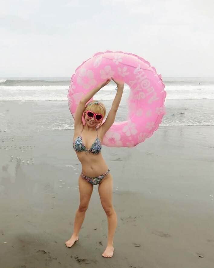 サングラスをかけて、ビーチでうきわを持ち上げてポーズを決めていて、浜田さんの楽しそうな様子が伝わってきますね。