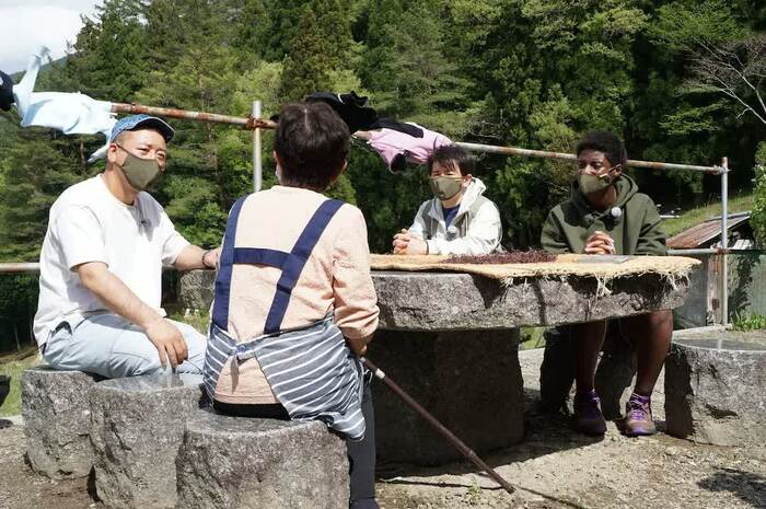 旅の途中、徳島県三好市で西村さんと濱口さんが散策していると、川辺に仁王立ちで待ち構えるエブリンさんを発見。