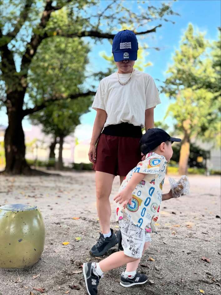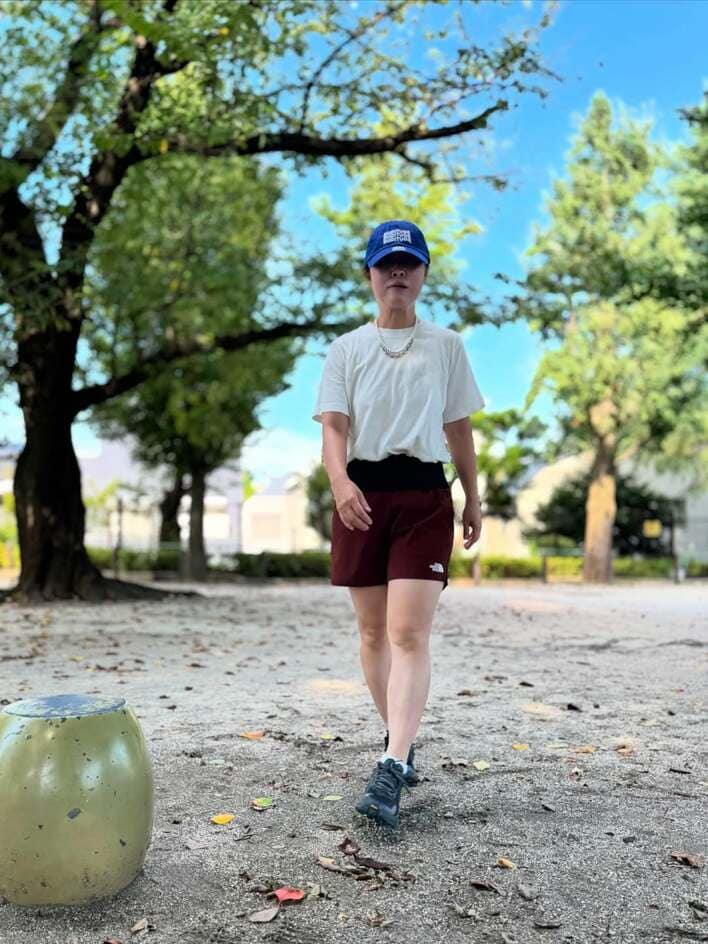 今回の投稿では「夏の公園コーデ いつでも走れるけど 蚊に刺されまくる」とつづり、白いT シャツにえんじ色のハーフパンツ、そしてキャップとスニーカーを合わせたスポーティーなコーディネートで、公園をのんびりと歩いているショットを公開しました。