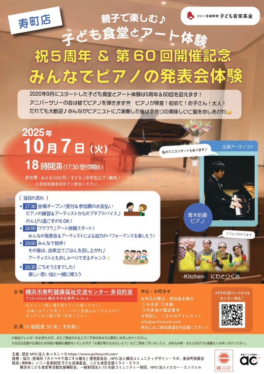 認定NPO法人あっちこっち(理事長:厚地美香子/神奈川県横浜市中区)が、2020年9月29日に始動した「子ども食堂とアート体験」がまもなく5周年を迎えます。さらに、10月7日(火)の開催回では事業開始5周年と、開催第60回目を同時に記念し、ピアノに触れたことのない子どもでも、プロのピアニストとともに楽しく実践できる「ピアノの発表会体験」を開催します。プロの芸術家を招き、こどもたちに美味しい食事を届けられるよう、今後も継続的な開催と新たな挑戦に向けて、私たちの活動にご賛同いただける協力者を広く募集しております。