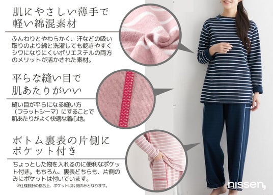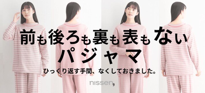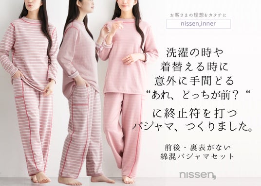 株式会社ニッセン(本社:京都市南区、代表取締役社長:羽渕 淳)は、前後・裏表を気にせず着られる新発想の女性用パジャマ「前後・裏表がない綿混パジャマ上下セット」を、「ニッセンオンライン」(https://www.nissen.co.jp/)にて販売開始しました。