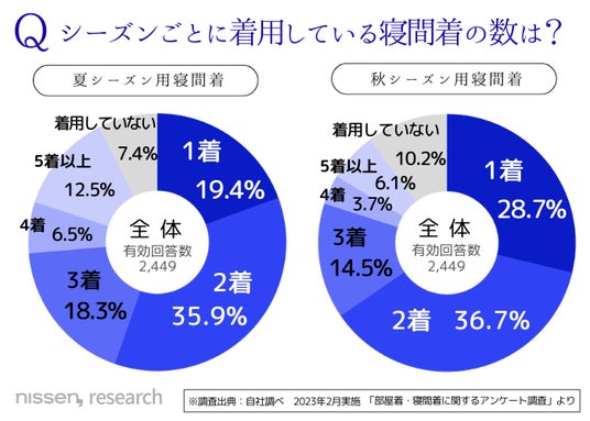 ・シーズンによって着用している寝間着の数は、夏、秋ともに「2着」が最も多い。
