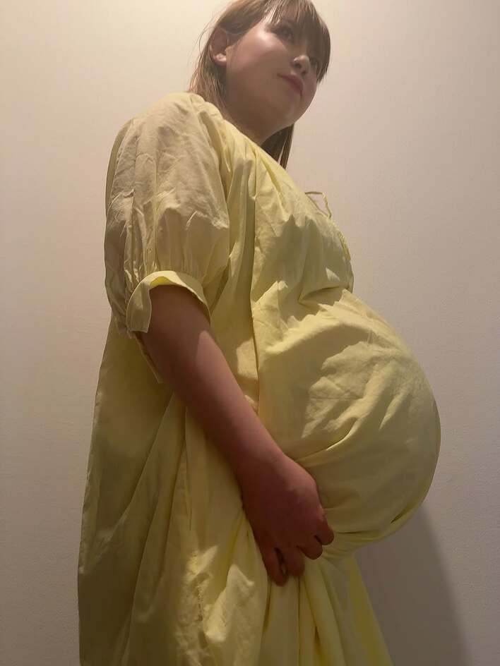 黄色いワンピース姿の中川さんは、大きなおなかに手を添えてパシャリ♪