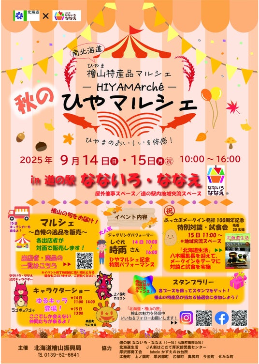 北海道檜山振興局では、管内の地域産品の認知度向上及び販路拡大を図るため、道の駅なないろ・ななえにおいて、檜山特産品マルシェ「ひやマルシェ -HIYAMArche-」を開催します!!