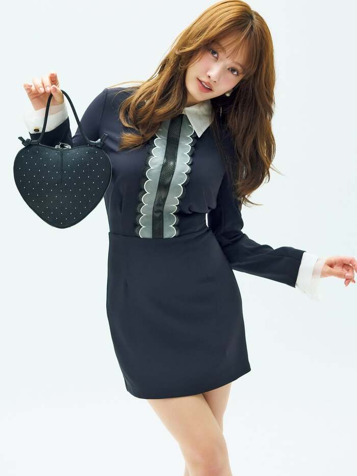 そして、襟付きのクラシカルなネイビーのワンピース姿のショットでは、ミニ丈からすらりと美脚をのぞかせていて、思わずドキッとしてしまいそう。