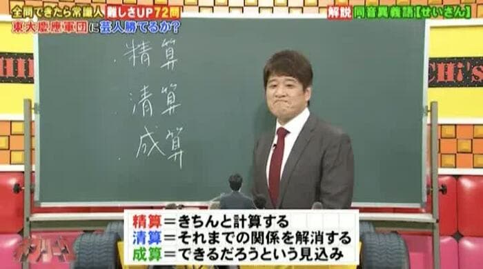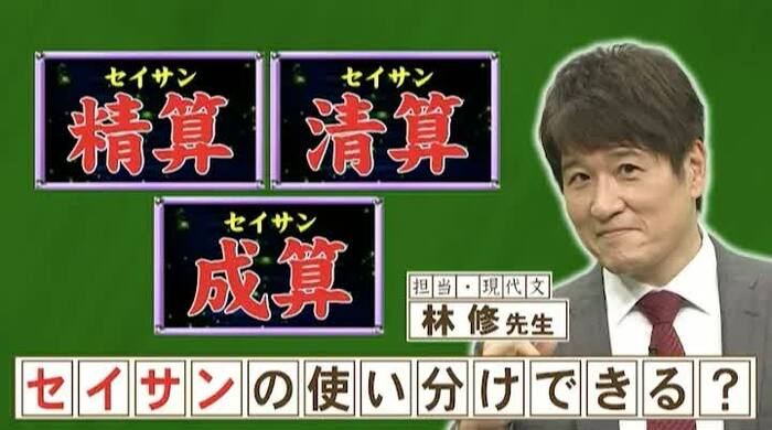 「セイサン」と読む漢字を書き分ける問題では、林修先生が「精算」「清算」「成算」のそれぞれの意味を教えてくれました。