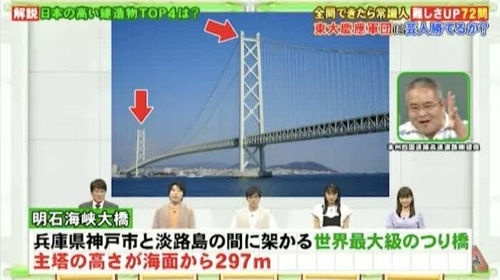 正解は、兵庫県神戸市と淡路島に架かる「明石海峡大橋」です。橋の主塔の高さ=297mという数字も、一緒に覚えておきたいですね。