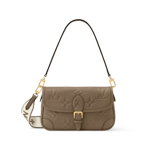 バッグ「ディアヌ」は、ゴールドカラーの金具で洗練された印象を添え、お好みで取外せるコントラストを効かせたテキスタイルストラップをあしらいました。さまざまな持ち方を楽しめるエレガントなスタイルで、内装にはファスナー付きフラットポケットを備え、普段の必需品をすっきり収納できます。