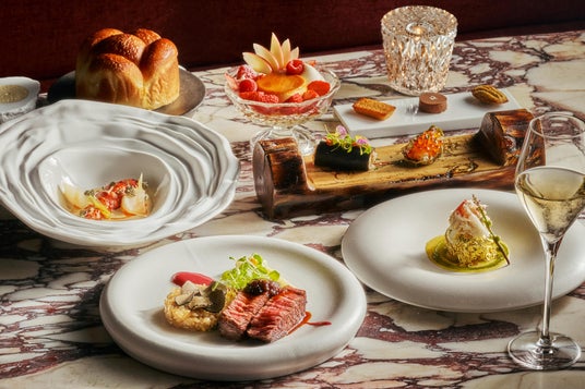 ブッシュドノエルから着想を得た「ハヤシ クリスマスログ」は、炭のクレープでハヤシライスを包み込んだ、見た目にも楽しい一皿です。カレー風味の蟹を詰めた揚げパンに、ゴールドをあしらった「タラバガニ」は、まるでクリスマスオーナメントのように祝祭のひと時を煌びやかに演出します。さらに、オシェトラキャビアとナンチュアソースを添えた「ロブスター」、香り高いトリュフとシャリアピンソースで仕上げた「江田和牛のステーキ」など、洋食のエッセンスを贅沢に取り入れた逸品が並びます。締めくくりには、ストロベリーカラメルソースと「きらぴ香」の爽やかな甘み、黒富士ファームの平飼い卵の優しい風味が響きあう「プリンアラモード」をお楽しみいただけます。