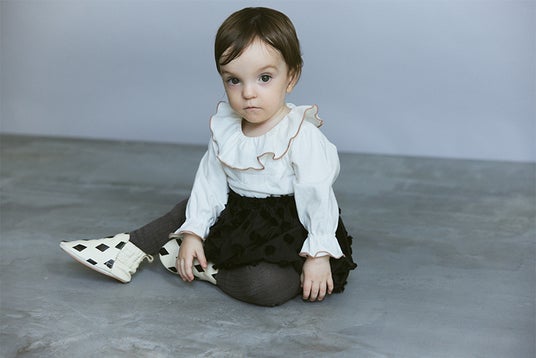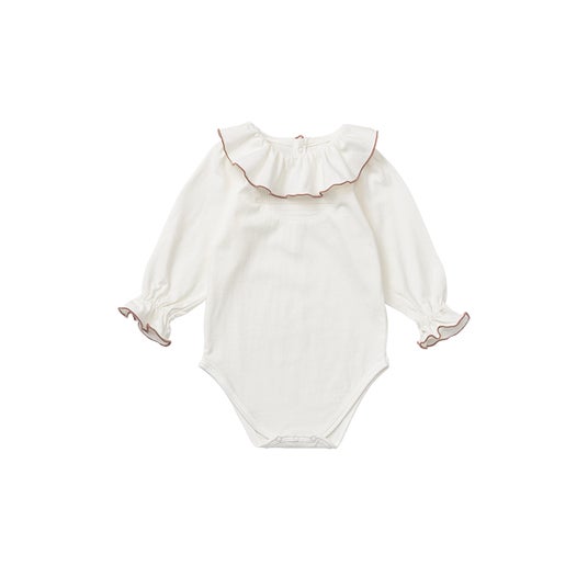 赤ちゃんの仕草をより愛らしく映すフリルは、ダスティピンクで縁取り、可憐なアクセントを添えました。
