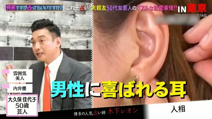 大久保さんは「雰囲気美人、どう受け取ろうかな…(笑)。でもね、分かります。なんか、モテるでしょ?って言われたり」というと、レオンさんは「そう、色っぽいですよ。人相学でいうところの、“男性に喜ばれる耳”の持ち主です。そんな耳なかなかない!」と絶賛しました。