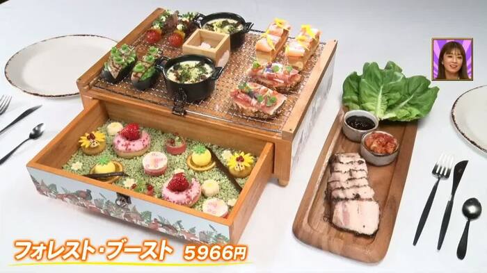 メインディッシュ級の料理が一口サイズでたくさん食べられるというお得なラインナップに加え、森の中をイメージした可愛らしいスイーツが登場。さらに、森の朝靄(もや)をイメージした映えまくりの演出も楽しめます。