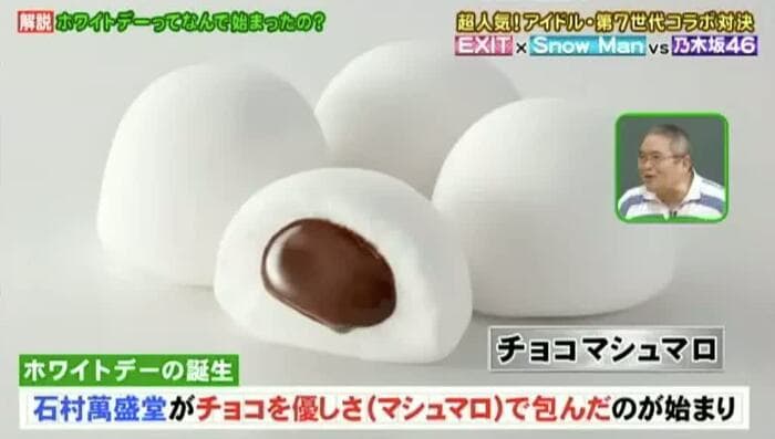 バレンタインにもらったチョコレートを“僕の優しさ”をというマシュマロで包んでお返ししたらどうかと、チョコマシュマロという商品を開発したのが始まりだそうだ。
