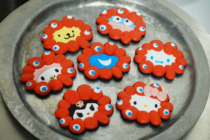 公開された写真には、ミャクミャクとサンリオキャラクターがコラボしたデザインのクッキーが並んでいます。クッキーの外側はミャクミャクの赤い部分、内側はポムポムプリンやシナモロール、マイメロディなどサンリオキャラたちの顔が描かれています。