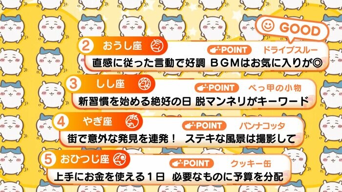 『めざましテレビ』で放送中の「ちいかわ占い」 テレビ放送がない日はお休みで、月~土:朝7時以降に更新予定です。