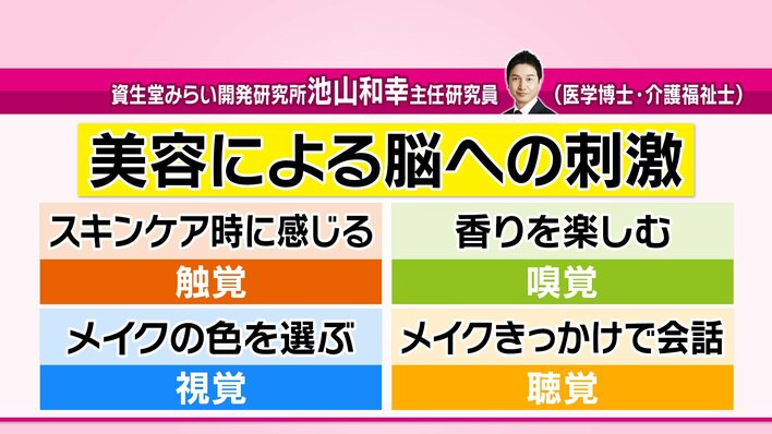 資生堂みらい開発研究所の池山和幸主任研究員によると、3kgほどある腕を顔の高さに浮かせながらメイクをする作業で使う筋力は、食事の2〜3倍!また、メイクをするだけで「触覚」「嗅覚」「視覚」を使うほか、人との会話が増えて「聴覚」にも刺激が加わるのだそうです。