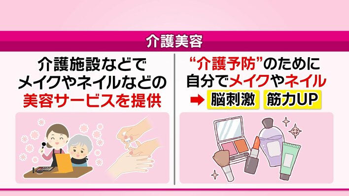 最近、高齢者向け施設やデイサービスなどで取り入れるところが増えているという「介護美容」。プロにメイクやネイルをしてもらうだけではなく、高齢者が自分でメイクやネイルに挑戦することが“介護予防”につながると注目されているそう。
