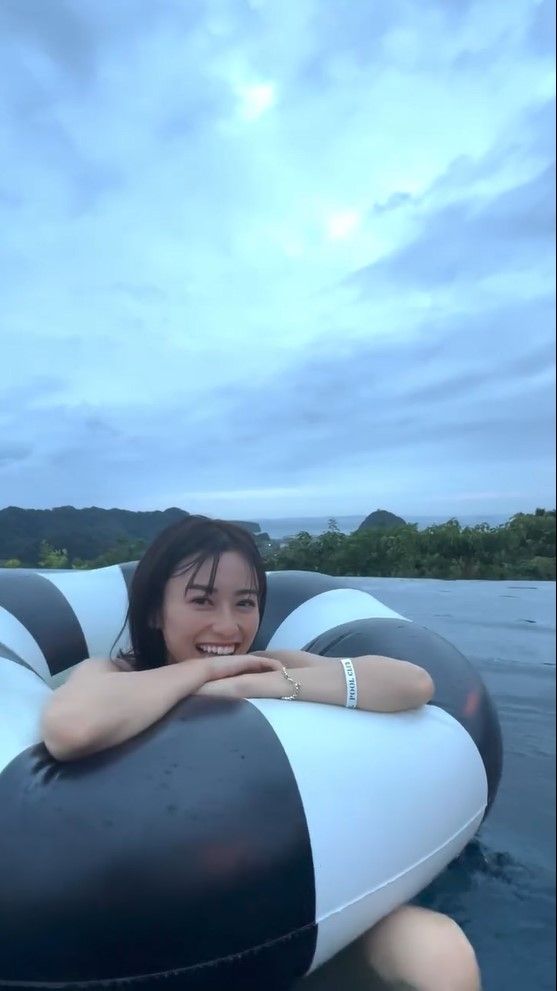開放的なインフィニティプールで浮き輪に入り、ぐるぐると回りながら満面の笑顔で楽しんでいました。