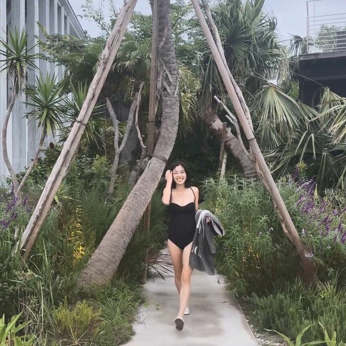 また、水着姿で一本道をランウェイに見立て、モデル歩きをしている様子も公開。