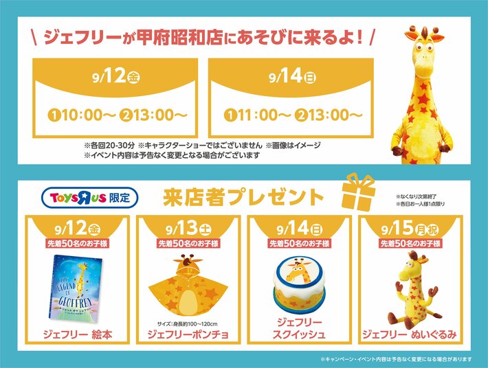 また、各店のオープン日から数日間、トイザらスオリジナルノベルティのプレゼントや、公式キャラクター「キリンのジェフリー」とのグリーティング、人気おもちゃ・ベビー用品のスペシャルセールなど、子どもから大人まで楽しめるイベントを実施予定です。
