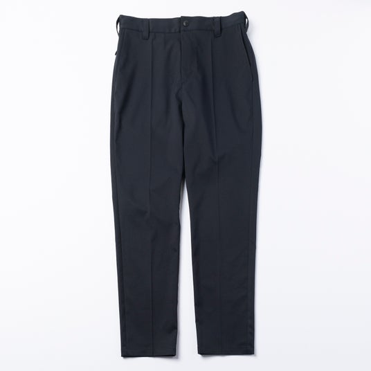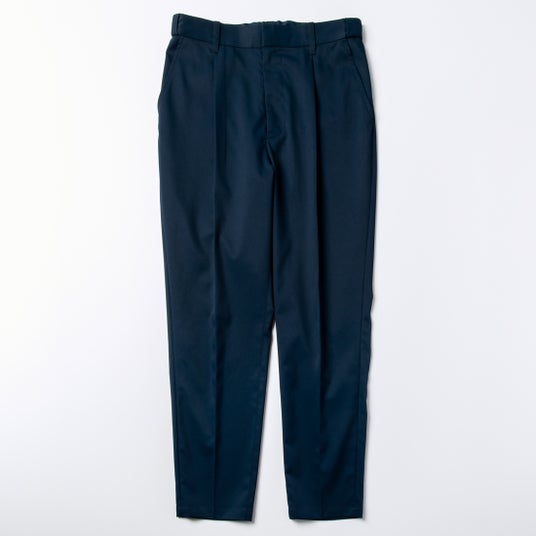 特徴:ウエストゴムを両サイドに内蔵することで、腰回りのもたつきを無くし、スタイル良く見えるデザインに。形はテーパードで、足を長く見せるセンタープレス加工を施しました。