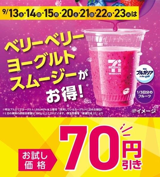 株式会社セブン‐イレブン・ジャパン(本社:東京都千代田区、代表取締役社長:阿久津 知洋)は、「セブンカフェ スムージー」の人気商品「ベリーベリーヨーグルトスムージー」を、2025年9月13日(土)~15日(月)および9月20日(土)~23日(火)の合計7日間限定で、通常価格より70円引きにて販売するセールを全国のセブン‐イレブンにて実施いたします。