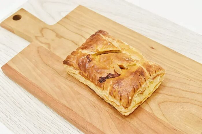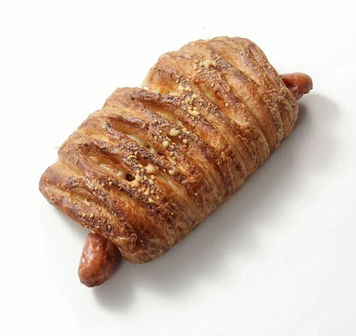 あらびきソーセージと粒マスタードをさくさくのデニッシュ生地で巻いて焼き上げた人気商品だ。